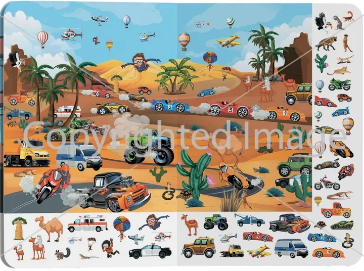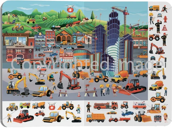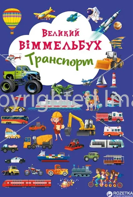 Що всередині? Автобуси, вантажівки, пожежні машини, поїзди, літаки, кораблі — весь транспортний світ на яскравих розворотах. Кожна сторінка — окрема локація з десятками деталей.