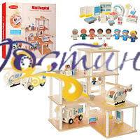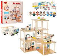 Дерев'яна іграшка Гараж MD 2391 станція швидкої допомоги, ш46, 5-Г46-в60см, 3 поверхи, меблі, фігурки, вертоліт, машина, мед.інструменти, в кор-ке. Розмір - 52-48-10см, Матеріал - дерево.