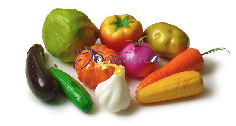 Використовується в якості демонстраційного матеріалу під час вивчення природознавства в початкових класах. Технічні характеристики: Муляжі виготовлено з пінопласту.Розміри муляжів - в натуральну величину.У комплект входить 10 муляжів у складі: капуста, картопля, морква, помідор, огірок, цибуля, часник, кукурудза, баклажан або кабачок, кукурудза.