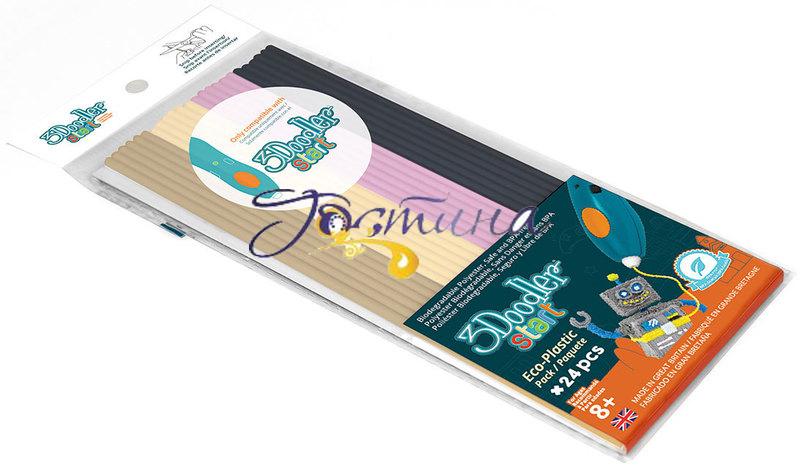 Стрижні виготовлені з харчових безпечних нетоксичних матеріалів, які повністю здатні біологічно руйнуватися протягом 45 днів при контакті з грунтом. Еко-пластик тягнеться в 10 разів більше своєї первісної довжини, таким чином при плавленні одного стержня виходить нитка до 150 см. Пластик плавиться при низьких температурах, в уникненні отримання опіків. Протягом 20 секунд матеріал залишається пластичним, дозволяючи підправити готовий виріб. Абсолютно безпечний при попаданні в рот. Не залишає слідів при попаданні на одяг. Даний набір підходить тільки для 3D-ручки 3Doodler Start.