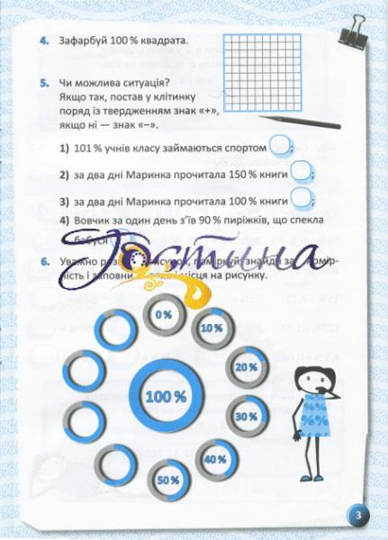 Посібник містить усе потрібне, щоб упевнено користуватися поняттям «відсоток»: • Правила розв’язування основних задач на відсотки;• Приклади розв’язання задач двома способами;• Близько 50 захопливих тренувальних вправ;• Майже 40 задач практичного змісту. Для вчителів загальноосвітніх навчальних закладів і учнів 5–11 класів для роботи на уроках і вдома.