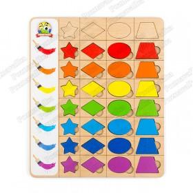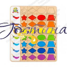 Комплектація:- Одна плашка під фігури- 7 фігур зірки в 7 кольорах- 7 фігур ромба в 7 кольорах- 7 фігур овалу в 7 кольорах- 7 фігур трапеції в 7 кольорах