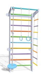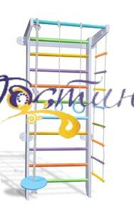 Матеріал спортивного куточка: 1. Боковини шведської стінки - сосна 2.Перекладіни шведської стінки - деревина твердих порід ясен, клен, бук. 3. Кільця - фанера 4. Канат (діаметр 22мм) - натуральна бавовна. У комплектацію входить: 1. Шведська стінка з турніком. 2. Мотузковий набір. 3. Диск. 4. Кріплення Допустимі динамічні навантаження: 1. На прекладіни шведської стінки і турнік - 100кг. 2. На мотузковий набір - 60кг Габаритні розміри спортивного куточка: 1. Висота шведської стінки з турником - 225см. 2. Ширина шведської стінки з турником - 87см 3. Виступ верхнього турніка вперед - 60см. 4. Ширина по відповідної планки 102 см