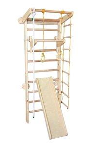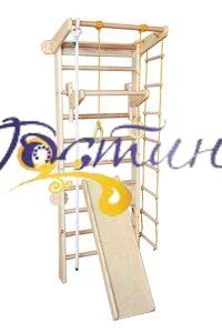 Матеріал спортивного куточка: 1. Боковини шведської стінки - сосна 2. Перекладини - деревина твердих порід ясен, клен, бук. 3. Кільця - фанера 4. Канат (діаметр 22мм) - натуральна бавовна. У комплектацію входить: 1. Шведська стінка з турніком. 2. Мотузковий набір. 3. Дитячий турнічек. 4. Дошка гірка 5. Кріплення Допустимі динамічні навантаження: 1. На прекладіни шведської стінки і турнік - 100кг. 2. На мотузковий набір - 60кг 3. На дитячий турнічек - 60кг. 4. На дитячу гірку - 50кг. Габаритні розміри спортивного куточка: 1. Висота шведської стінки з турником - 225см. 2. Ширина шведської стінки з турником - 87см 3. Виступ верхнього турніка вперед - 60см. 4. Ширина по відповідної планки 102 см