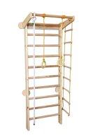 Матеріал спортивного куточка: 1. Боковини шведської стінки - сосна 2.Перекладіни шведської стінки - деревина твердих порід ясен, клен, бук. 3. Кільця - пластик. 4. Канат (діаметр 22мм) - натуральна бавовна. У комплектацію входить: 1. Шведська стінка з турніком. 2. Мотузковий набір. 3. Кріплення Допустимі динамічні навантаження: 1. На прекладіни шведської стінки і турнік - 100кг. 2. На мотузковий набір - 60кг Габаритні розміри спортивного куточка: 1. Висота шведської стінки з турником - 225см. 2. Ширина шведської стінки з турником - 87см 3. Виступ верхнього турніка вперед - 60см. 4. Ширина по відповідної планки 102 см