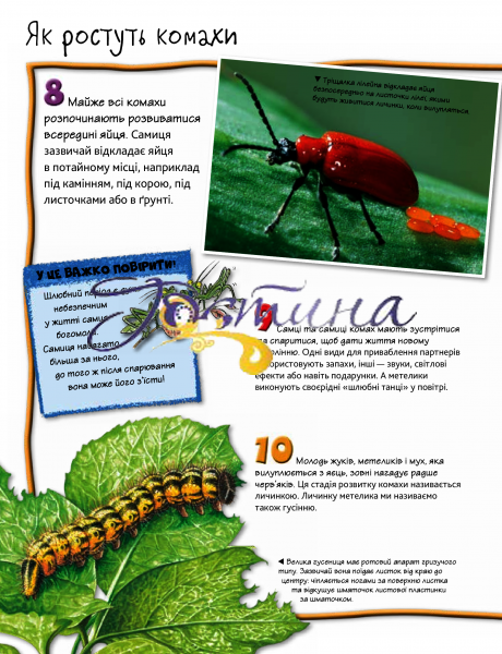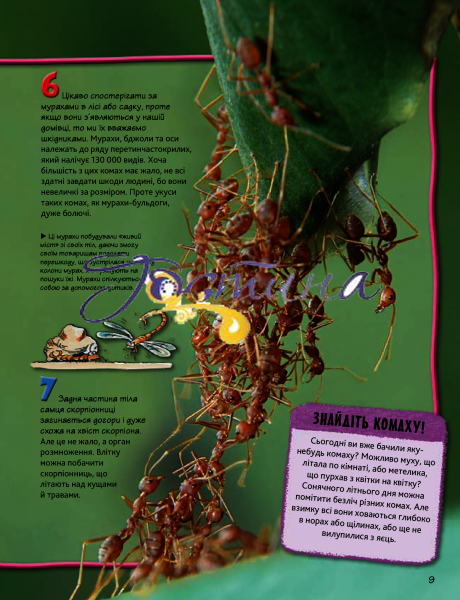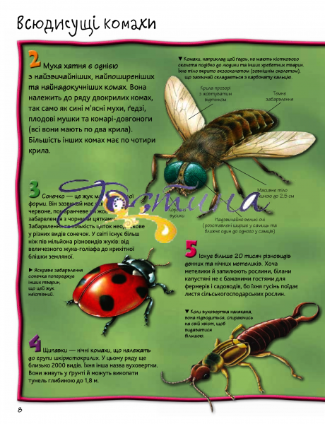 Цікаві факти, чудові ілюстрації, веселі вікторини, дотепні малюнки! Зазирніть у дивовижний світ комах, павуків та інших дрібних безхребетних! 100 фактів, чудові фотографії, цікаві пояснення та кумедні картинки висвітлять всі аспекти життя комах та інших дрібних істот, а відповівши на запитання, наведені і книжці, ви зможете перевірити свої знання щодо комах. Книжка в простій та доступній формі знайомить дітлахів з дивовижним світом комах, павуків та інших дрібних безхребетних. На кожній сторінці ви знайдете неперевершені малюнки та фотографії, які допоможуть дітям краще сприймати інформацію. А відповівши на запитання, наведені в книжці, вони зможуть перевірити свої знання щодо комах.