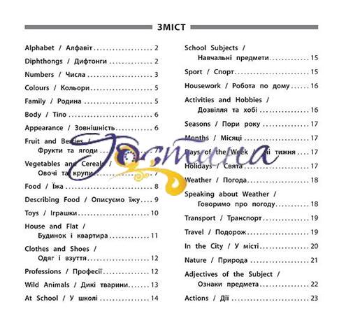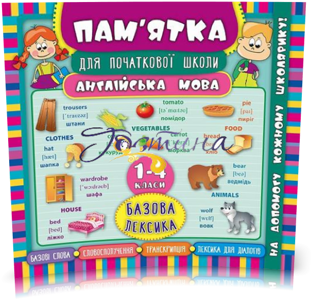Видання містить базову лексику англійської мови, яка вивчається у початковій школі. Слова розділені на тематичні групи, що допоможе учневі використати їх в усних та письмових роботах та легко розкрити кожну тему в повному обсязі.