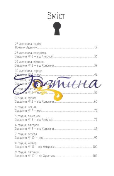 Різдво починається тоді, коли його відчуває наше серце. І в цьому очікуванні дива важливо бути поряд із тими, кого любимо, і дарувати світло тим, хто його потребує. Герої книжки створили власний адвент-календар. Щодня оповідачка, її чоловік Амвросій та приятелька Христина вигадують одне для одного завдання, які не тільки примножують радість, а й відкривають чимало нового зі світу культури. Цей затишний адвент-календар подарує віру в диво, яке неодмінно здійсниться, і стане для вас інтелектуальною грою-мандрівкою, у якій вільно й невимушено поєднуються особистості української та інших європейських культур. І будьте певні: під час виконування цих передріздвяних завдань зовсім не соромно зізнатися, що ти чогось не знаєш.