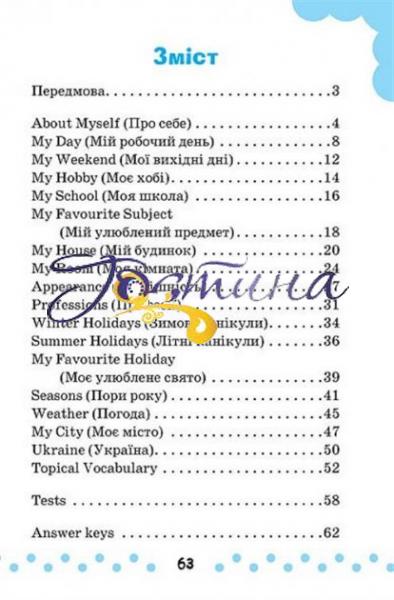 Посібники серії «English Topics» допоможуть молодшим школярам легко засвоїти базовий курс англійської мови. У них ви знайдете тексти для читання, словничок, у якому подано вимову і переклад ключових слів кожної тими, діалоги з перекладом, цікаві вправи для відпрацювання лексико-граматичних навичок та завдання для перевірки рівня знань дитини з граматики англійської мови.