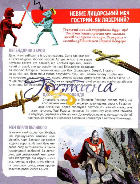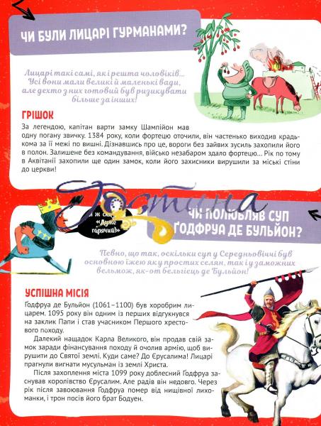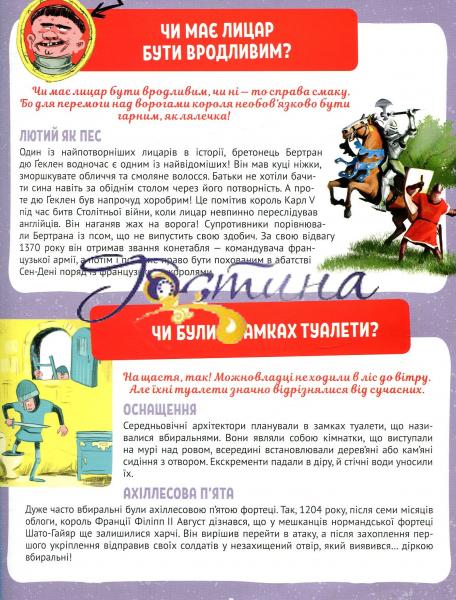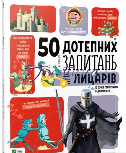 Чи носили лицарі бронежилети? Чи полюбляв суп Ґодфруа де Бульйон? Чи мали лицарі гармати? Перед вами 50 запитань про світ лицарів, до того ж одне незвичніше за інше! Запитання, ясна річ, трохи дивні, однак відповіді на них цілком серйозні, і вони допоможуть вам стати експертами в темі Середньовіччя, лицарів та за?мків. Ви дізнаєтеся багато нового про найвідоміших лицарів, видатні замки, лицарський кодекс честі, найнеймовірніші поєдинки і найруйнівнішу зброю... Усі тексти супроводжуються кумедними малюнками та чудовими реалістичними ілюстраціями.