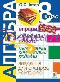 У посібнику запропонована повна добірка матеріалів з алгебри 8-го класу відповідно до оновленої шкільної програми 2017 року: вправи, рівневі самостійні роботи, тематичні контрольні роботи та завдання для експрес-контролю знань. Призначений для вчителів, методистів та учнів загальноосвітніх навчальних закладів.