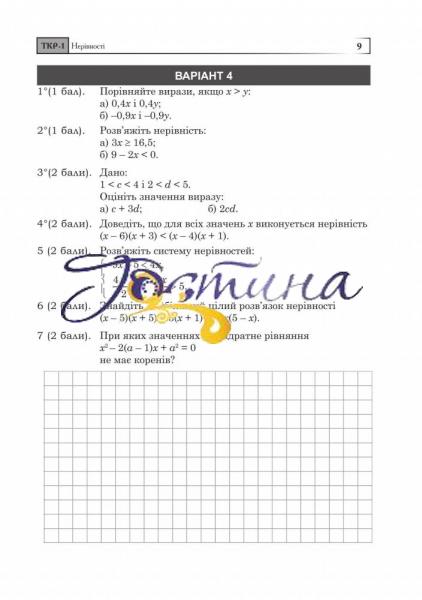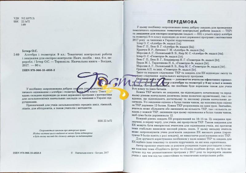 У посібнику запропонована добірка завдань для проведення тематичного оцінювання з алгебри і геометрії учнів 9-го класу. Тексти завдань складено відповідно до нової державної програми з математики для загальноосвітніх навчальних закладів за чинними в Україні підручниками.