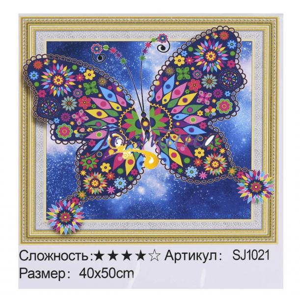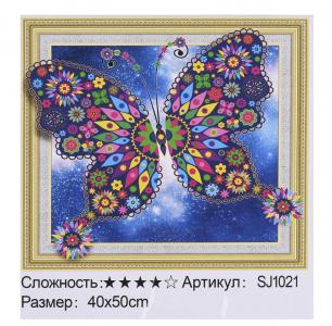 Тип картини – метелики; Складність – 4; Матеріал полотна – ДСП; Розмір полотна – 40х50см; Форма алмазу – кругла; Упаковка – коробка. Комплектація набору: - полотно на підрамнику; - стрази всіх кольорів, необхідних для викладення картини (кожен колір в окремому пронумерованому пакетику); - 3 ЗІП-пакети; - Пластиковий піддон для алмазів; - Спеціальна ручка для роботи з алмазами; - Відбиток.