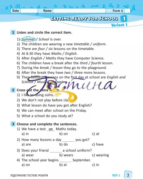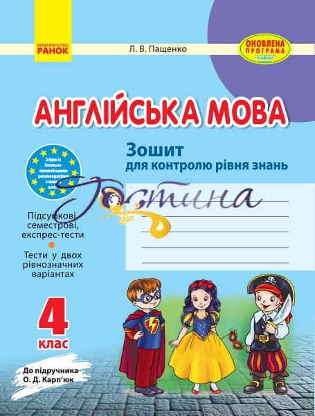 Зошит, укладений до підручника О. Д. Карп’юк, містить підсумкові (за кожною темою) та семестрові тестові роботи, а також експрес-тести з англійської мови для учнів 4 класів.