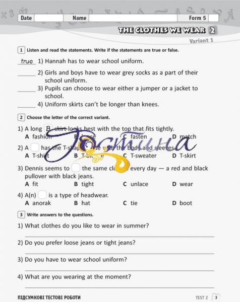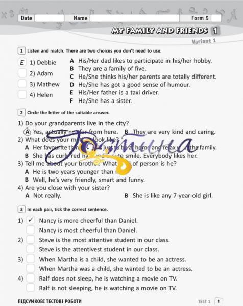 До кожної теми зошит з англійської мови 5 клас Мясоєдова пропонує до виконання підсумковий тест. Також у зошиті містяться роботи для семестрового контролю та експрес-тести. Кожна робота включає два варіанта. Перший варіант можна використовувати для контролю, а другий для роботи над помилками. В представлені роботи включені завдання на аудіювання і встановлення зв’язків відповідно до прослуханого або визначення коректності твердження, завдання на вибір підходящої відповіді до питання, визначення наявності та відсутності граматичних помилок у реченнях, завдання з формування письмової відповіді на поставленні питання тощо. На кожній сторінці присутнє місце з можливістю вказати прізвище учня, що дозволяє використовувати сторінки зошита як окремі картки, що дуже зручно.