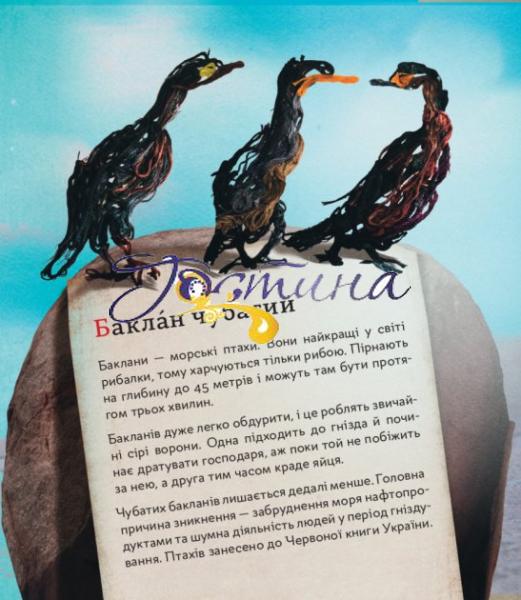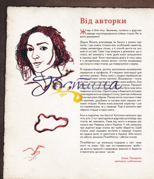В Україні можна зустріти 436 видів птахів. Багато з них—рідкісні, занесені до Червоної книги України, захищені європейським законодавством з охорони природи. Художниця Ірена Панаріна обрала 33 пташки, які проживають чи залітають в Україну, та створила унікальну пташину абетку. За нею можна не тільки вчити літери, а й познайомитися з пернатими, дізнатися цікаві історії про пташаче життя, що покращить запам'ятовування абетки. Книжка ілюстрована в оригінальній авторській техніці ниткових зображень. Це видання—не лише для маленьких опановувачів грамоти, а й для широкого кола поціновувачів рідної природи.