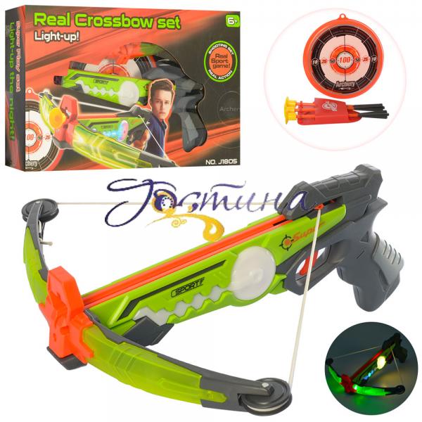 Арбалет M 6042 31см, стріли на прісосках3шт, мішень, світло, на батарейках, в коробці. Розмір - 41-25-8см, Матеріал - комбінований матеріал, Тип упаковки - коробка.