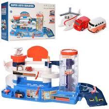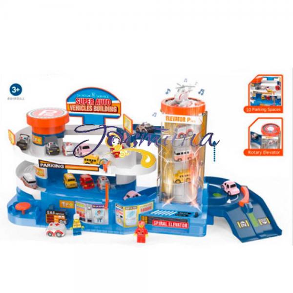 Трек - паркінг - гараж з автоматичним підйомником арт. 103-33A Представляємо новинку - паркінг з автоматичним підйомником. Машинки з легкістю піднімаються на автоматичному ліфті на верхній поверх (під час підйому машинок горить світло і грає весела музика). А потім - скочуються звідти, на шляху руху вниз розташовані 2 шлагбаума, які можна опускати і піднімати. Також передбачені зони для паркування машинок і вертолітний майданчик. У першому рівні парковки розташована тих станція з кімнатою очікування для найбільш цікавих сюжетів. У набір входить три машинки і вертоліт. Автоматичний підйомник працює від 3-х батарейок АА. Розмір упаковки: 42-32-18 см