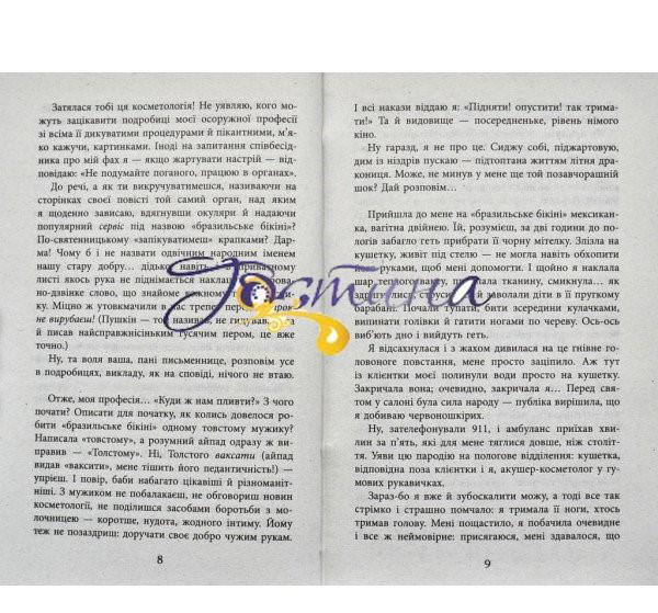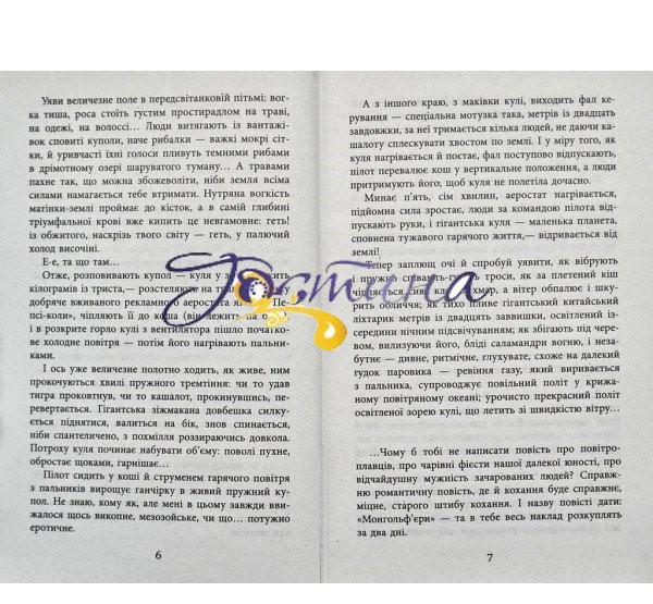 У центрі оповідання цієї, часом шокуючої книжки — Жінка. Героїня, в юності — парашутистка і пілот повітряної кулі,— переживши особисту трагедію, змушена робити геть іншу справу в іншій країні, можна сказати, в задзеркаллі: вона косметолог, живе і працює в Нью-Йорку. Ціла низка дивних персонажів проминає перед її очима, бо, за родом своєї нинішньої професії, героїня стикається з фантастичними, на сьогоднішній день майже буденними «гендерними перевертнями», зі збентежливими, а іноді й відразливими картинками життя суспільства. І, як не дивно, з цієї гірлянди, за висловом героїні, «калік» виростає гротесковий, трагічний, нікчемний і високий образ сучасної любові.