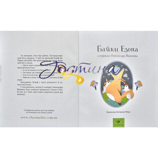 «Друзі пізнаються в біді» — цей крилатий вислів належить «батькові байки» Езопу. 2600 років тому Езоп створив понад 400 байок. Увесь цей час їх переказували з уст в уста, і в такий спосіб до нас дійшло близько 100 творів. Переказ байок Езопа для цієї книжки здійснив Олександр Виженко. На творах Езопа вчилися діти за часів Арістофана в Афінах. Відтоді багато змінилося, та людські вади лишилися тими самими. Сила байок Езопа не в повчальних висновках, а в «езоповій мові», алегоричних образах тварин: Вовк втілює жорстокість, Лисиця — хитрість, Орел — шляхетність тощо. Саме в такому вигляді ідея стає зрозумілою дитині.
