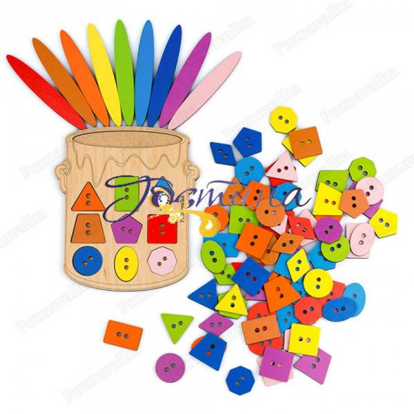 Фігури для шнурівки 81 шт. (Квадрат, коло, овал, трикутник, прямокутник, ромб, п'ятикутник, трапеція, восьмикутник) всіх кольорів (червоний, жовтий, жовтогарячий, синій, блакитний, зелений, фіолетовий, коричневий, рожевий) (3 * 4 см)