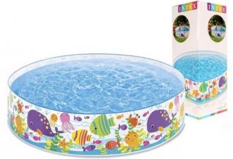 Надувний дитячий басейн має барвисте забарвлення із принтом у підводній тематиці - таке зображення на стінках басейну зробить купання вашої дитини ще веселішим і цікавішим. Басейн при 80%-у заповненні має об'єм - 800 літрів.