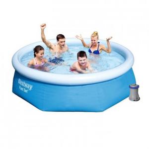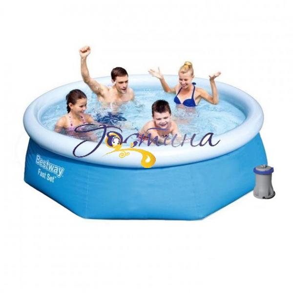 Загальні характеристики: Виробник: Bestway Країна виробник: Китай Тип: дитячі Форма: кругла Серія: Колір блакитний Серія: Fast Set™ Матеріал чаші: тришаровий ПВХ: ПВХ + скловолоконна сітка + ПВХ Матеріал товщина: кільця – 0.27 мм стінок – 0.50 мм дна – 0.25 мм Зовнішнє облицювання: синій Внутрішнє облицювання: малюнок Принцип установки: набуває форми при наповненні водою за рахунок надувного кільця Час монтажу: 15 хвилин + наповнення водою Габарити: Розмір: 244 х 66 см Діаметр: 244 см Висота: 66 см Внутрішній діаметр кільця: 195.2 см Зовнішній діаметр кільця: 221 см Фактична висота (до кільця): 53 см Місткість води, об'єм 90%: 2 100 Комплектація: Тип комплектації: Стандарт Картриджний насос: 1250 л/год Картриджний насос (артикул): Картриджний фільтр насос Bestway 58381, 1250 л/год, тип I Змінний картридж: 1 шт.: тип «I» Змінний картридж (артикул): Змінний картридж для фільтру насоса Bestway 58093 тип «I» 1 шт, 9 х 8 см Насос для накачування: немає в комплекті – необхідно докупити Intex 68612 Сходи: ні, рекомендовані сходи висотою 84 см (артикул 58430) Тент: ні (необхідні для: тент захист від сміття, підстилка - від проколів) Підстилка: ні (необхідна для захисту дна від проколів) Адаптер для зливу води: є Адаптер для зливу води (артикул): Адаптер Bestway 6D1419 для садового шланга. Перехідник для зливного клапана басейнів DVD з інструкціями: ні Підключення: Тип підключення чаші: на хомутах Набір для підключення: набір форсунок Набір для підключення (артикул): Набір форсунок у зборі Bestway 22331 для підключення басейнів Bestway на хомутах, 32 мм Заглушки до виходів під фільтрацію: є Заглушки для виходів під фільтрацію (артикул): Заглушка Bestway 4H018D для басейнів Power Steel, Steel Pro Зливний клапан: Вбудований зливний клапан полегшує злив. Прикріпити адаптер (додається) до садового шлангу для відведення води в потрібне місце.