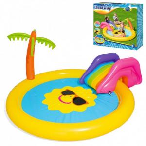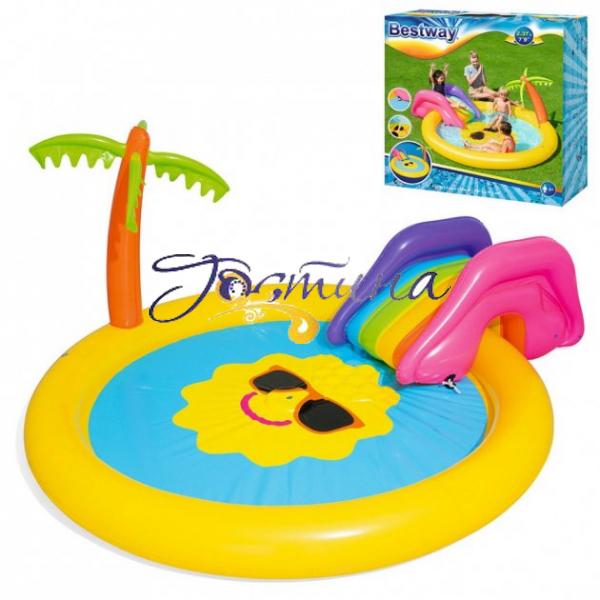 Ваш карапуз гарантовано закохається з першого погляду в цей симпатичний, яскравий і привабливий басейн. На дні чаші намальовано усміхнене сонечко, а бортик прикрашений пальмою. У комплекті також йде і райдужна гірка, яка подарує дитині море веселощів. Літні забави стануть ще веселіше з таким басейном!