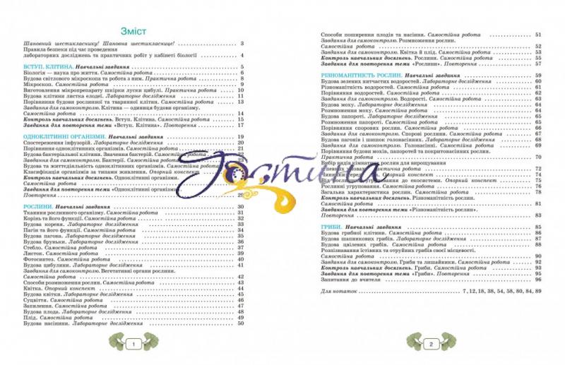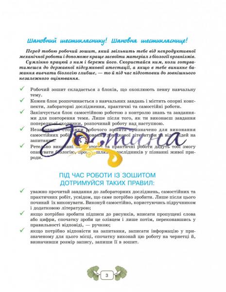Робочий зошит з біології учня 6 класу складається з розділів, що охоплюють п’ять навчальних тем програми. Кожен розділ розпочинається з навчальних завдань, містить лабораторні дослідження, практичні та самостійні роботи, а закінчується завданнями з контролю навчальних досягнень та завданнями для повторення.