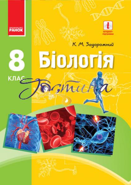 Пропонований підручник (автор Задорожний К.М.) відповідає чинній програмі з біології для 8-го класу. Зверніть увагу на те, що текст поділений на теми, які присвячені окремим системам органів людського організму або його загальним особливостям. У кінці підручника розміщено словник біологічних термінів, алгоритми виконання лабораторних досліджень, робіт і дослідницьких практикумів, а також додаток.