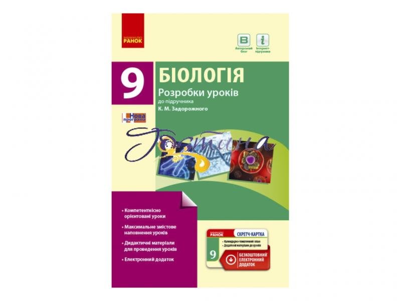 Посібник укладено відповідно до чинної програми з біології для 9 класів загальноосвітніх навчальних заведеній.Пособіе містить розробки всіх уроків з методичними рекомендаціями щодо форм, засобів і методів навчання. Посібник орієнтований на підручник «Біологія. 9 клас »автора К. М. Задорожного.Пособіе має електронний додаток, в якому розміщений календарний план і додаткові матеріали до уроків у форматі Word.Пособіе призначене для вчителів біології та студентів педагогічних спеціальностей.