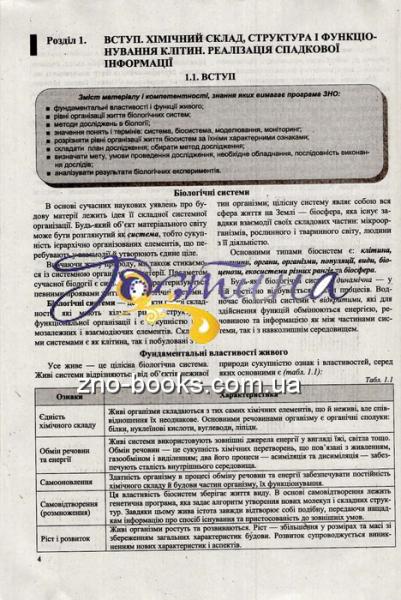 Довідкова частина посібника складена відповідно до програми зовнішнього незалежного оцінювання з біології 2024 року і містить розділи: «Вступ», «Молекулярний рівень організації життя», «Клітинний рівень організації життя», «Неклітинні форми життя», «Організмовий рівень організації життя», «Надорганізмові рівні організації життя», «Історичний розвиток органічного світу», які, у свою чергу, розділені на теми. Наприкінці кожної теми вміщено тестові завдання та запитання для самостійної перевірки рівня засвоєння матеріалу. Відповіді до тестових завдань містяться наприкінці посібника.