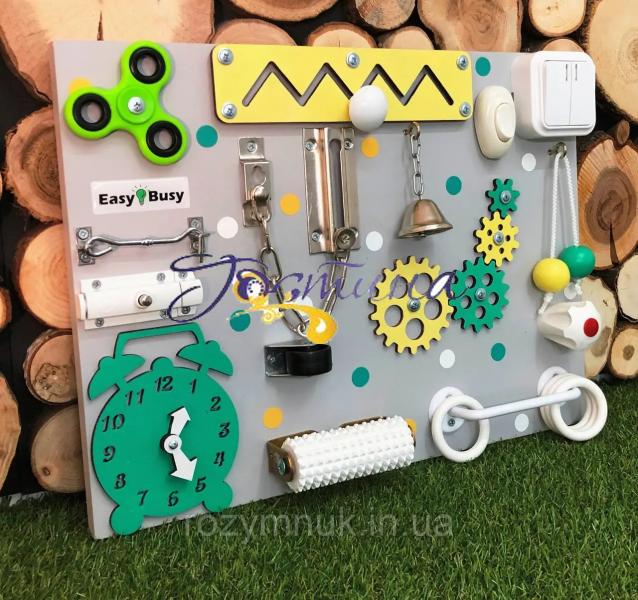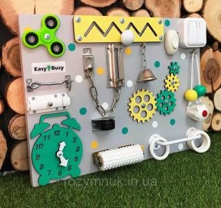 Бізіборди Easy Busy моделі "Компакт" — з огляду на назву моделі чітко зрозуміло основну особливість таких бізібордів — компактність. Такі моделі підійдуть як для батьків із малим квартирним простором, так і для тих, хто бажає зробити малюкові особливий подарунок, але не великих розмірів. Мінусом такої моделі є низька маневровість у компонуванні елементів з огляду на обмеження простору. З огляду на практику в стандартне наповнення можна додати ім'я дитини, один із елементів замінити, наприклад, на ліхтарик. Звичайно ж за Вашим запитом там можуть бути розміщені саме ті елементи, які Ви хочете там бачити, пам'ятайте про межі самої основи. Мінуси невеликих розмірів легко компенсуються плюсами мінімальної ціни, яка в половину менша за модель "стандарт".