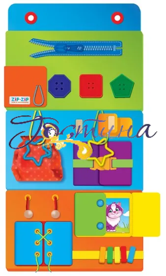 Бизиборд - це іграшка, яка допомагає малюкові познайомитися з зовнішнім світом через цікавлять його предмети. З даним набором дитина вивчить кольори і навчиться користуватися різними застібками для одягу: кнопка, ґудзик, шнурівка, застібка фастекс, петелька, липучка, знімні елементи і т. д. Тренує логіку, увагу, уяву та дрібну моторику.