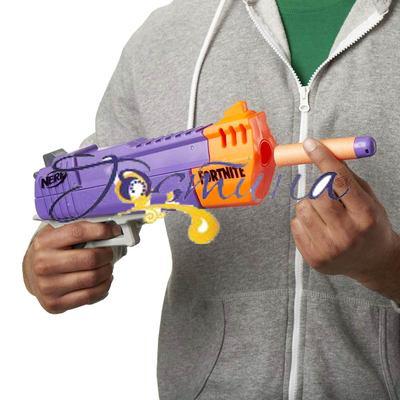 Механічний однозарядний пістолет оснащений фронтальним завантаженням та повторює дизайн бластера з комп'ютерної гри Фортнайт.