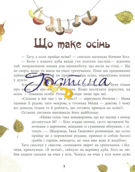 Книга вийшла напередодні осені і це найкращий час, щоб почати знайомство з нею. Адже її події починаються з того, що маленьке білченя Білл дуже сильно чекало осені. А як не чекати, коли він її жодного разу не бачив, а всі навколо тільки про неї й говорять. Хто каже, що вона мокра, хто – довга, хто – руда… Самі кажуть, що прийде не з порожніми руками, а потім готують їй припаси… Чого тільки не кажуть про осінь дорослі. Разом з Біллом та його друзями юні читачі проживуть усі пори року і дізнаються, що кожна з них по своєму прекрасна і чарівна. Так-так, саме чарівна! Адже Білл не звичайне білченя, а чарівник-початківець… Майже кожну сторінку книги супроводжують душевні акварельні ілюстрації автора і художника Ольги Фадєєвої.