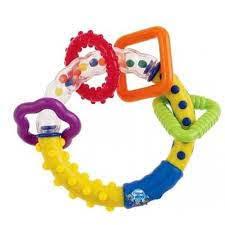 Всередині прозорої частини брязкальця малюк побачить різнокольорові кульки, які створюють звук брязкальця.