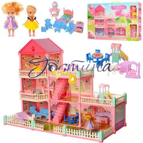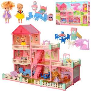 Будиночок досить місткий, у ньому зможуть розміститися кілька лялечок. У будиночку 6 кімнат, тераса, дитячий майданчик. Каркас та дах пластикові, стіни та підлога виконані з міцного картону. На додаток до будиночка в комплект входить комплект меблів для повноцінного облаштування житла. Ідеально підходить для ляльок та фугурок 10 см. Розмір будиночка: 57-73-34 см