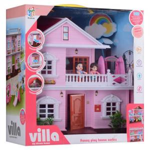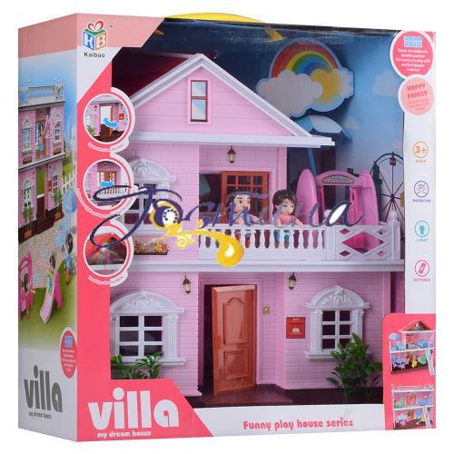 Барвистий ляльковий будиночок KB99-33-A з меблями та фігурками порадує кожну дівчинку красою і функціональністю. Іграшка являє собою двоповерховий котедж розмірами 34х31х16 см. З великою терасою на даху. Стіни будиночка пофарбовані в ніжний рожевий колір, що неодмінно сподобається маленький принцесі. Фасад будинку прикрашений декоративними вікнами і квітами, вхідні двері відкриваються. Якщо будиночок розгорнути, то потрапляєш всередину будинку. Усередині будинок поділений на кімнати: ванна, кухня, спальня, в яких можна красиво розташувати меблі. Щоб грати було ще цікавіше, в наборі передбачені світлові ефекти.
