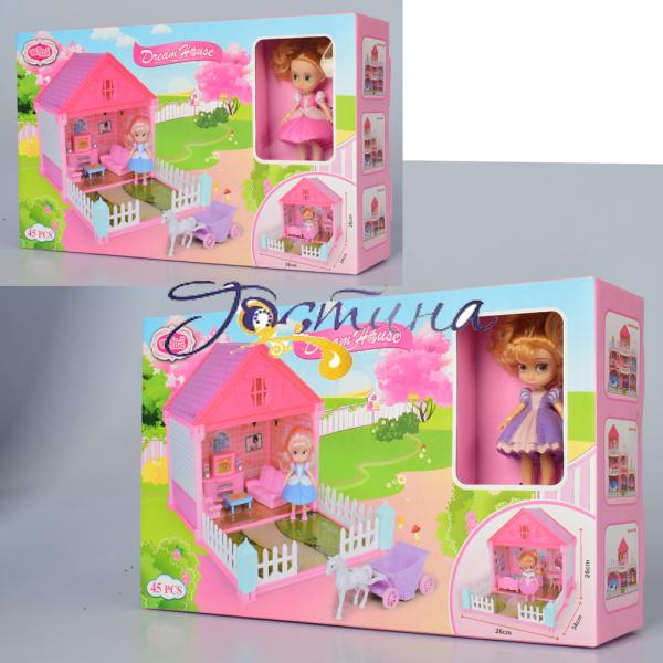 Ляльковий будиночок виконаний у відмінному дизайні, забарвлений в приємні кольори і оформлений вікнами, що відкриваються дверима і ігровим майданчиком.У комплекті з будиночком, ви знайдете лялька 12 см, різні меблі.Розмір будиночка: 26-26-34 см.