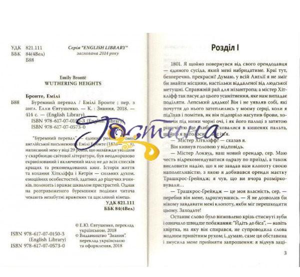 “Буремний перевал” — єдиний роман відомої англійської письменниці Емілі Бронте (1818—1848), написаний нею у віці 29 років, що назавжди увійшов у скарбницю світової літератури, був неодноразово екранізований і включений мало не до всіх списків кращих та рекомендованих книг. Історія життя та кохання Хіткліффа і Кетрін — сильних духом, емоційних особистостей, здатних до рішучих вчинків, полонить і вражає шквалом пристрастей. Однак на розтривоженого буремними подіями читача чекають незабутні враження та щасливий кінець.