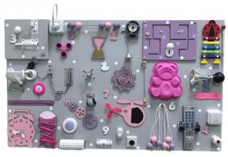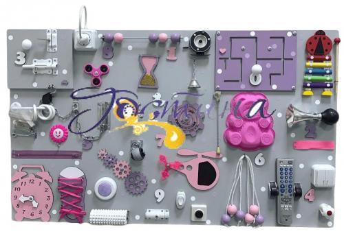 Всі ми знаємо, що в маленькому віці малюки дуже допитливі. Дитині потрібно все чіпати, клацати і клацати все, що можна! Для цього була і створена іграшка бізіборд. Адже точний переклад цієї чудової іграшки-тренажера 'дошка, щоб зайняти малюка'. Бізіборд містить багато різних замків, дзвіночків, ланцюжків, кнопочок, шнурівок і т.д. Основною перевагою цієї моделі є можливість вдалою компонування різних елементів, які найбільш цікаві дітям: ксилофон, розетка, спінера і тд.  Кольорове оформлення залежить від Ваших переваг і обмовляється при оформленні замовлення.  Наші бізіборди 100% безпечні для дітей, фарби на водній основі, які абсолютно не токсичні, використовуємо спеціалізований столярний клей, який відрізняється міцністю клейового шва і є абсолютно нешкідливим! Елементи можна розміщувати в різному порядку від Вашого бажання (2-3 дня на збірку). Всі елементи, які використовуються для бізіборда, проходять попереднє очищення і термообробку для безпеки. Розмір, см: 100х60 Кількість деталей: 35 Колір: Рожево-Бузковий (фіолетовий)