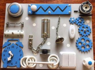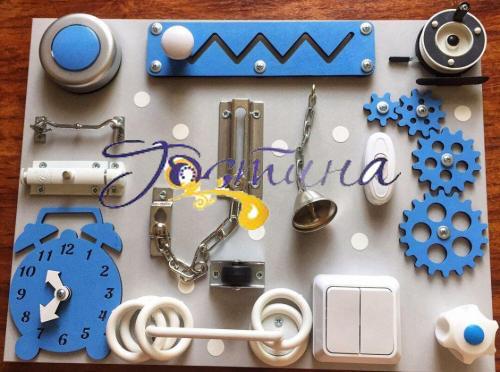 Всі ми знаємо, що в маленькому віці малюки дуже допитливі. Дитині потрібно все чіпати, клацати і клацати все, що можна! Для цього була і створена іграшка бізіборд. Адже точний переклад цієї чудової іграшки-тренажера 'дошка, щоб зайняти малюка'. Бізіборд містить багато різних замків, дзвіночків, ланцюжків, кнопочок, шнурівок і т.д. Основною перевагою цієї моделі є можливість вдалою компонування різних елементів, які найбільш цікаві дітям: ксилофон, розетка, спінера і тд.  Кольорове оформлення залежить від Ваших переваг і обмовляється при оформленні замовлення.  Наші бізіборди 100% безпечні для дітей, фарби на водній основі, які абсолютно не токсичні, використовуємо спеціалізований столярний клей, який відрізняється міцністю клейового шва і є абсолютно нешкідливим! Елементи можна розміщувати в різному порядку від Вашого бажання (2-3 дня на збірку). Всі елементи, які використовуються для бізіборда, проходять попереднє очищення і термообробку для безпеки. Розмір, см: 30х40 Кількість деталей: 15 Колір синій