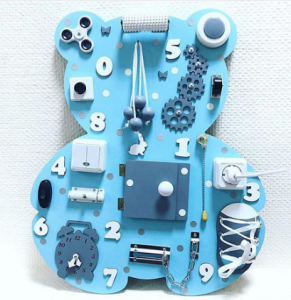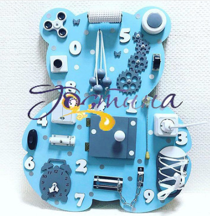 Всі ми знаємо, що в маленькому віці малюки дуже допитливі. Дитині потрібно все чіпати, клацати і клацати все, що можна! Для цього була і створена іграшка бізіборд. Адже точний переклад цієї чудової іграшки-тренажера 'дошка, щоб зайняти малюка'. Бізіборд містить багато різних замків, дзвіночків, ланцюжків, кнопочок, шнурівок і т.д. Основною перевагою цієї моделі є можливість вдалою компонування різних елементів, які найбільш цікаві дітям: ксилофон, розетка, спінера і тд.  Кольорове оформлення залежить від Ваших переваг і обмовляється при оформленні замовлення.  Наші бізіборди 100% безпечні для дітей, фарби на водній основі, які абсолютно не токсичні, використовуємо спеціалізований столярний клей, який відрізняється міцністю клейового шва і є абсолютно нешкідливим! Елементи можна розміщувати в різному порядку від Вашого бажання (2-3 дня на збірку). Всі елементи, які використовуються для бізіборда, проходять попереднє очищення і термообробку для безпеки. Розмір, см: 50x65 Кількість деталей: 20 Колір блакитний