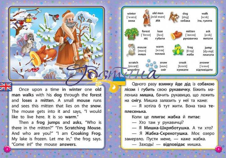 Кожна книга серії містить україномовний та англомовний варіант казки, відомої кожному з нас з раннього дитинства, комплексний і тематичний словники, а також цікаві завдання на відпрацювання прочитаного, відповіді на які слід шукати серед наклейок. Видання дозволить дитині поповнити словниковий запас, повправлятися в граматиці і правописі англійської мови, а також весело і корисно провести час!