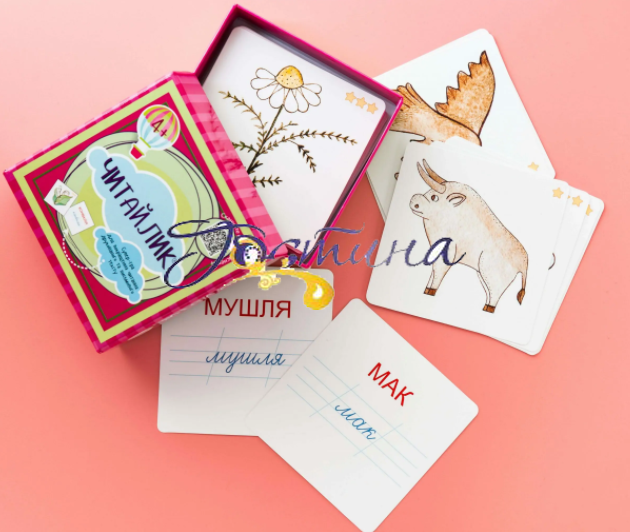 Вміст: 70 двосторонніх карток (малюнок + підпис друкованим та письмовим шрифтом)