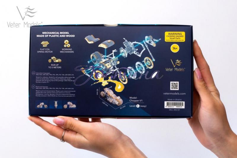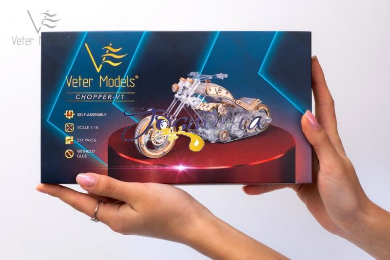 Механічна модель байка для самостійної збірки від компанії Veter Models є оптимальне поєднання фанери і пластика, що робить модель менше за габаритами, не втрачаючи при цьому функціональність. Гнучкість ліній, витонченість дизайну, увага до деталей і діючий механізм, що приводиться металевою пружиною, дають незабутній ефект занурення в світ коліс, двигунів і асфальту.