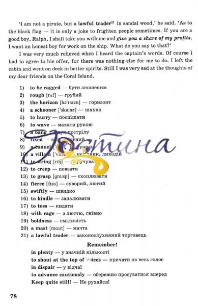 Книжка для читання англійською мовою містить оповідання шотландського письменника Р. Балантайна «Кораловий острів». Посібник допоможе сформувати в учнів навички читання англійською мовою на середньому рівні. Вправи систематизовано за рубриками, що сприяє кращому розумінню тексту, засвоєнню складних граматичних явищ англійської мови, розвитку творчих здібностей учнів. У книжці також подано словник нової лексики, список прислів’їв і неправильних дієслів, відповіді до деяких завдань.