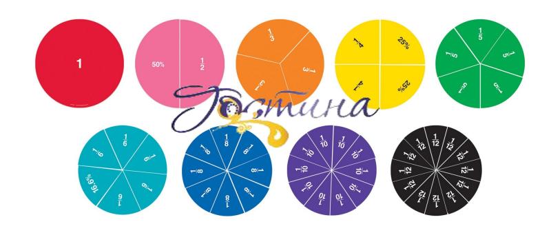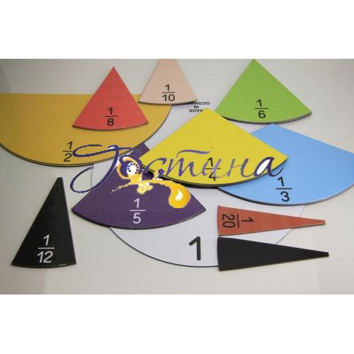 Набір магнітів Дроби - 12 кіл розділених на однакові сектора. На кожному секторі магніт. Цей набір дробів є дуже цікавим і пізнавальним посібником. З його допомогою дуже легко пояснити дитині поняття дробу і розподіл. Діаметр магнітів 25 см