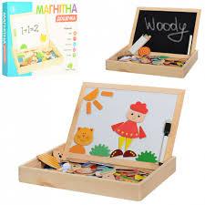 Дерев'яна магнітна двостороння дошка для малювання. На одній стороні дошки можна малювати фломастером, маркером або складати фігури з магнітних деталей, а на іншій стороні дошки можна малювати крейдою. Біла сторона для фломастерів, темна сторона для крейди. У комплекті: дощечка двостороння, магнітні фігури, маркер, крейда, губка, дерев'яний лоток. Розмір досточки 31х24 см.